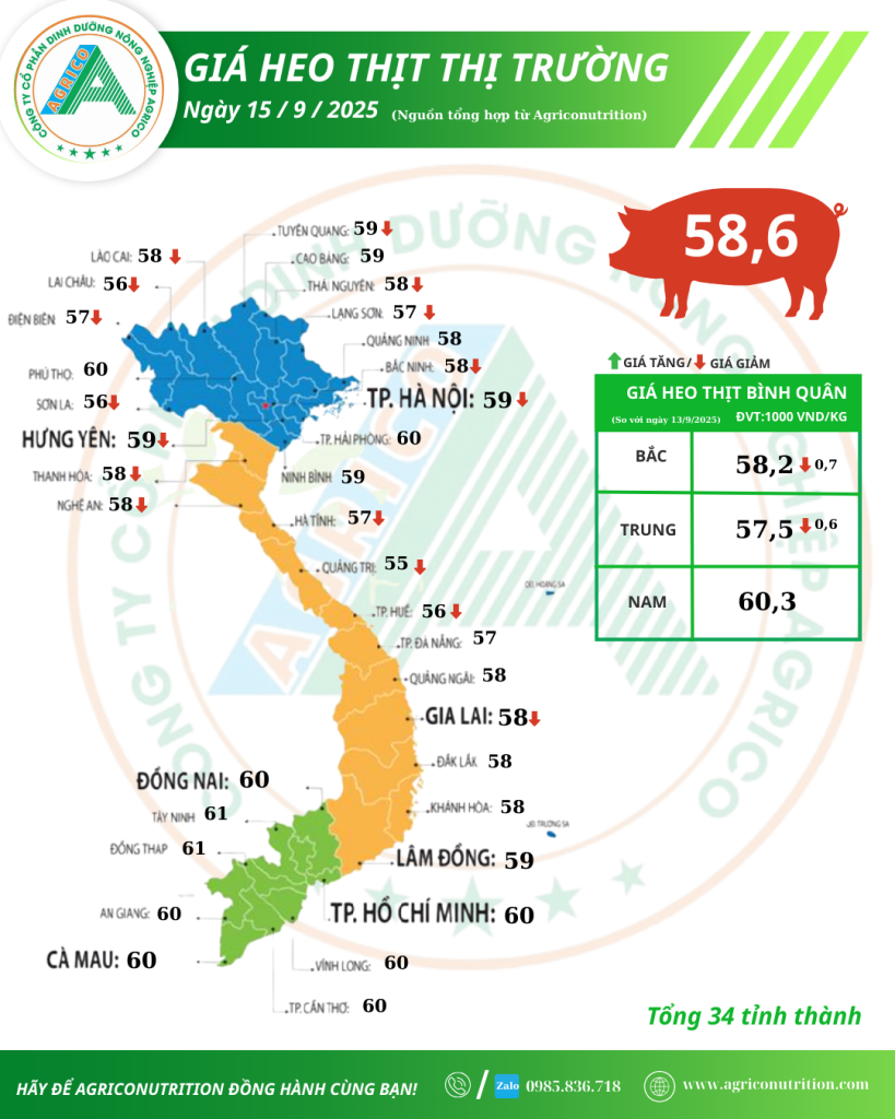 Theo số liệu tổng hợp từ Agriconutrition, giá heo thịt ngày 15/9/2025 có xu hướng giảm nhẹ tại nhiều địa phương, đặc biệt là khu vực miền Bắc và miền Trung. Mức giá bình quân toàn quốc được ghi nhận ở mức 58,6 nghìn đồng/kg, giảm so với ngày 13/9/2025.
